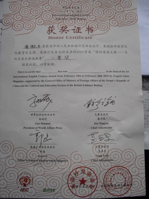 首届国际英语大赛“文化交流大使选拔赛”是由外交部主管,英语沙龙杂志社、英国驻华大使馆文化教育处共同主办的大型英语能力比赛。前外交部长李肇星先生为本次大赛题词,前外交部副部长吉佩定、国务院新闻办副局长吴伟、中国前驻联合国大使沈国放以及包括英美在内的英语国家驻华使馆主管教育的官员出席了在北京举行的大赛新闻发布会。这是国内首届以文化交流为主题的大型英语赛事,比赛内容突破了学校课本的范围,以介绍中国文化为主线,注重口头表达能力和沟通交流能力。大赛的目的是推荐选拔出未来的文化使者,促进中外文化交流,培养、储备中国对外交往的人才。 本次大赛由地区选拔赛、省总决赛以及全国总决赛组成。比赛内容涉及笔试、听力、辩论、演讲、才艺表演、看图说话以及机智问答等环节,主要考察选手对中西方文化的了解、英语口语、逻辑思维等能力。新葡官网英语071班凌傲冬顺利通过河南赛区的初赛(写作)和复赛(演讲和评委提问),和其他两名选手代表河南省(大学组)参加了2010年2月18日至21日在北京举行的全国总决赛。经过听力测试、口语交流、评委提问(即兴问答)和辩论赛等多个环节的激烈角逐,凌傲冬同学从120名决赛选手中脱颖而出,最终进入前八名辩论决赛,并获得一等奖(其他七名选手分别来自广东外语外贸大学、上海财经大学、南京大学、云南财经大学)。 3003新葡官方网站近年来一直重视英语教学的改革与创新,不断提高教学质量,积极开展“英语角”、“英语演讲比赛”等二课活动,形成了良好的教风和学风。本次大奖的获得是新葡官网英语专业长期加强语言综合能力培养的结果。