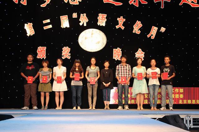 歌曲比赛期间穿插了四个颁奖环节,到场领导嘉宾分别为日语演讲比赛、英语演讲比赛、日语配音比赛、英语配音比赛、大学生实用性英语比赛和外文歌曲比赛一二三等奖获得者颁奖。本届外语文化月共产生各类个人和集体奖项89个。