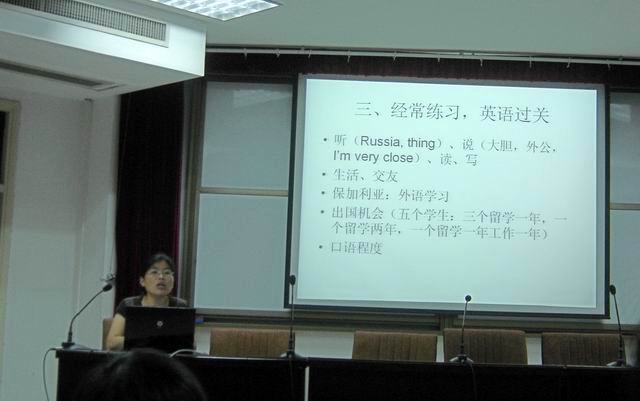 闫秋霞老师2010年9月赴保加利亚索菲亚大学教授汉语,7月底闫老师将再度启程前往保加利亚传播中国文化。闫秋霞老师分别从“一、汉语知识,国情文化;二、针对学生,注意难度;三、经常练习,英语过关;四、了解中国,了解世界;五、相信自己,尊重对方;六、入乡随俗,善于表达;七、自力更生,寻求帮助;八、一切从头,及时调整;九、抓住机遇,完成学业;十、光荣任务,仍需努力。”等十个方面给同学们讲解了对外汉语教学的任务、要求、困难和同学们学习过程中需要了解掌握的知识、努力培养和锻炼的能力。