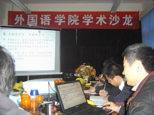 受郭教授睿智言语及学术思维的启发,大家对多模态理论在教学和科研中的应用途径、理论假设及可行性分析等纷纷发表了自己的看法,并进行了热烈的讨论。褚振莉老师提出多模态学习理论对于教学提出了新的挑战,传统教学中静态内容太多,应增添动态内容,进一步激发学生课堂英语学习兴趣。孙健老师汇报了供多媒体、多模态学习的网络教室改造情况和学生自主学习情况,并展示了09级A班学生在线自主学习情况视频短片。李凌云提议大学英语听说教程中加入视频短片,这样有助于学生的听力理解。王哲老师展示了自己制作的多媒体课件,初步展示了大学英语青年教师在多模态教学中所做的有益探索和教学实践,郭教授建议其阅读认知负荷理论,加强理论对教学改革与实践的指导作用。常尚起老师提出在长对话中加入视频流,促进学生的理解,同时就如何从根本上改善学生的英语听说能力提出自己的困惑和思考。杨道云老师提出视听说课型课堂设计方案,初步尝试以任务教学法为导向,将本学期的视听说课课堂教学划分为与单元主题有关的文化解码导入活动、自主听力检查、纯音频听力训练及策略指导、视说训练、Role Play等教学环节,应加强对有效完成每个教学任务所需时间的科学分配及教学实施策略的研讨,对此,郭教授建议多融入理论内容,加强理论导向,建议在设计中把握几个问题,即:明确定位目标、设计依据、设计步骤、模态选择等,达成一个共识:浸泡式语言学习最优化,图、文、音等多模态学习次之,纯文本学习效果最差。杨道云和董晓航老师表示大外一部和二部要加强集体协作,以期做到教学资源共建共享。杨庆龙老师把单模态比作一维化文本,比作剧本,对其进行解码后形成多维化文本,变成舞台上生动的戏剧演出,提出单模态和多模态的相互转化是一个编码解码的过程。关成勇老师提出将多模态理论应用到庭审语言中,并提出如何转写多模态语料及如何建立多模态语料库的问题(借鉴张德禄的多模态媒体系统);并提议将多模态语料转写经验应用于多模态教学研究。对于如何把握教学科研人员和技术人员的关系,郭教授提议双方多进行交流,只有多交流,才能更好地了解对方的需要,才能更好地促进技术为教学科研服务。郭教授还提出让大家学习Instructional Design,建构主义等理论,阅读“多元读写能力”(multi-literacy)相关文献,可采用问卷调查等方式对多模态教学和单模态教学进行效果对比研究。