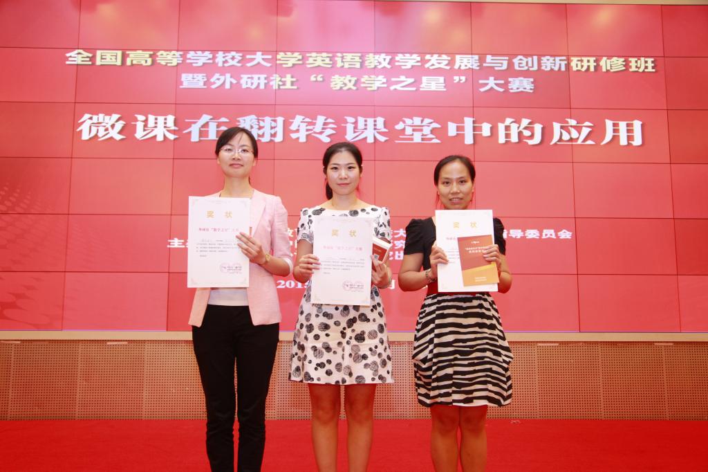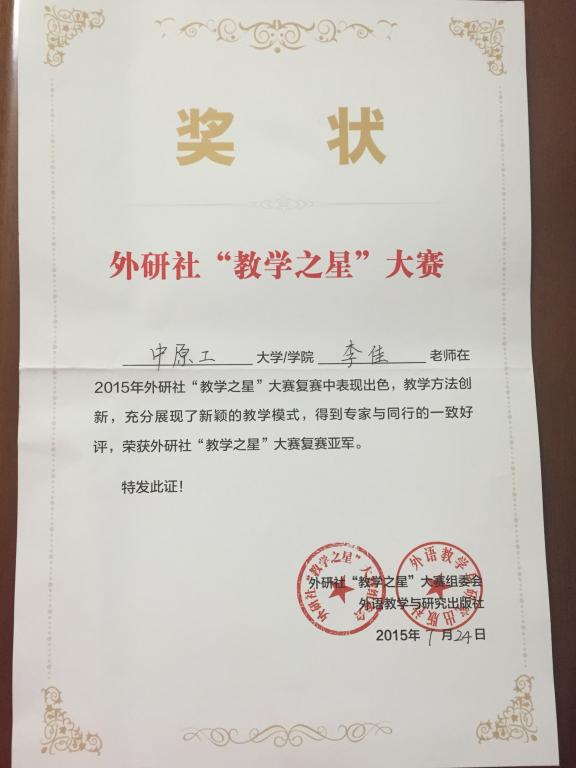 2015年7月23-26日,在长沙举办的全国高等学校英语教学发展与创新研修班暨外研社 “教学之星”(大学英语组)大赛中, 新葡官网3003新葡官方网站青年教师李佳,基于微课和翻转课堂等新型教学方法,以地道的英式发音,扎实的语言基本功,活泼生动的课堂气氛等,获得了复赛亚军第一名(大学英语组)的好成绩。