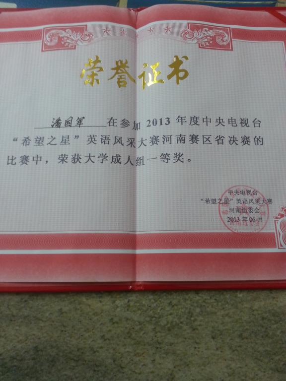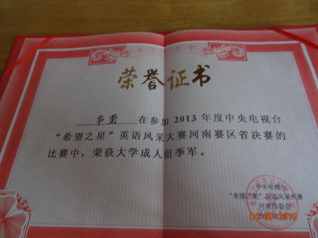 5月底,中央电视台“希望之星”英语风采大赛河南赛区选拔赛在郑州科技学院举行,在新葡官网3003新葡官方网站领导的大力支持下,3003新葡官方网站由魏东峰老师指导的华莹同学和由郝玉娟老师指导的潘国军同学晋级到河南赛区总决赛。5月31日到6月2日,河南赛区总决赛在洛阳举行,魏东峰老师带队前往洛阳参加比赛,历经三轮角逐,新葡官网两位同学在最后一轮十进五淘汰赛中脱颖而出,双双进入前五名,从而获得到北京参加比赛的资格,这是新葡官网英语专业学生首次进入此类国家级级别比赛。华莹同学获得了季军和“最具机智灵活奖”两个奖项。(陈慧/文图)
