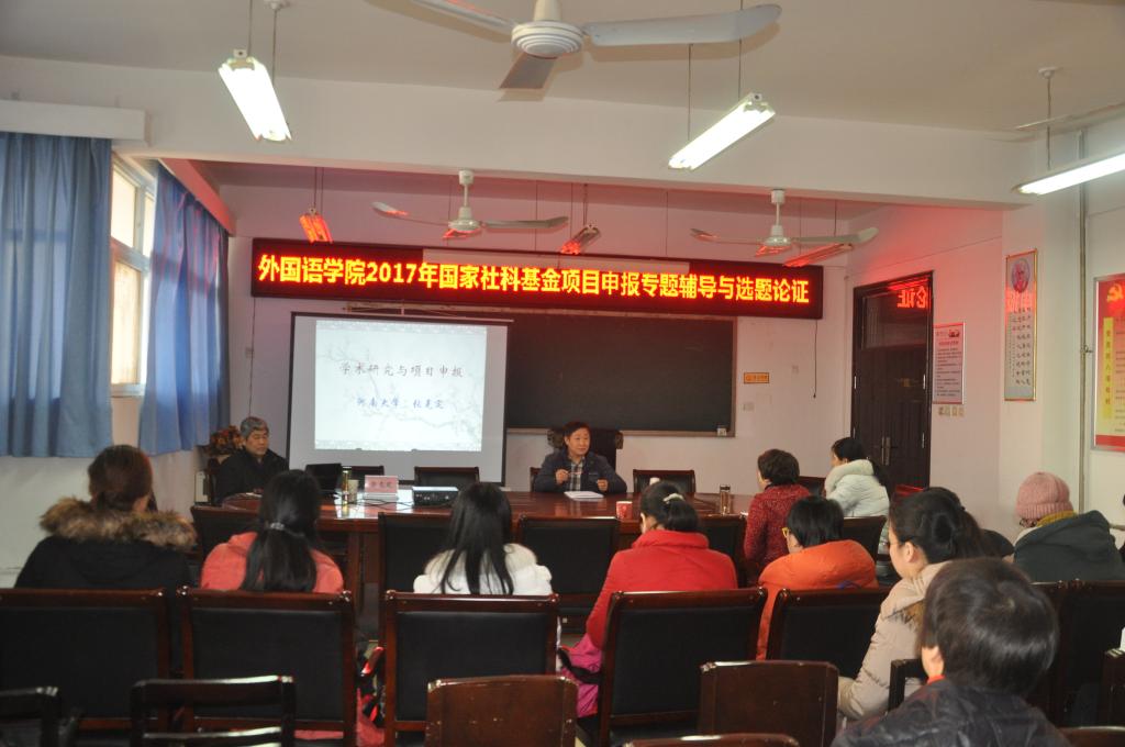 2016年12月22日下午,在11号楼会议室,3003新葡官方网站召开了2017年度国家社科基金项目申报专题辅导与选题论证讲座。河南省高等学校哲学社会科学优秀学者张克定教授应邀莅临新葡官网,做了题为“学术研究与项目申报”专题辅导讲座。3003新葡官方网站全体申报人员及部分学术骨干参加了辅导讲座。讲座由3003新葡官方网站院长郭万群教授主持。