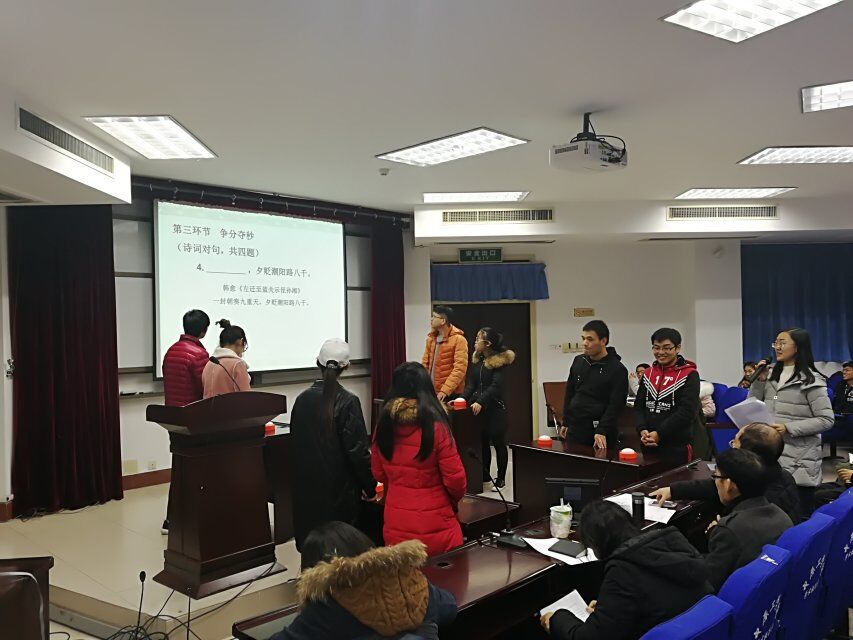 为弘扬中华优秀传统文化,继承优秀诗词经典,培养学生人文综合素养,由学生处、团委、语言与传播研究所主办,3003新葡官方网站汉语国际教育系、团总支、文艺社承办的中原工学院首届诗词大会于第14周周三至周五在4号楼311教室举行了复赛。复赛期间由3003新葡官方网站副院长柴高洁、汉语国际教育系主任陈大为、汉语国际教育系副主任任永安、汉语国际教育系朱洁老师,彭琰老师担任评委,新葡官网众多诗词爱好者参与到这场文化盛宴。
