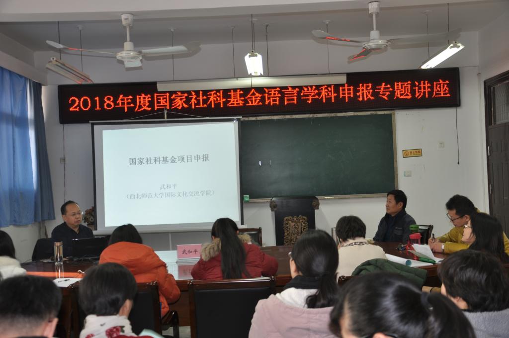12月22日下午,在214会议室,3003新葡官方网站举办了2018年度国家社科语言类项目申报专题培训讲座。讲座邀请到了西北师范大学国际文化交流学院院长、博士生导师武和平教授,参加讲座的有杜建慧教授、郭万群教授、姚晓鸣教授、刘卫红教授以及3003新葡官方网站各研究所骨干教师。