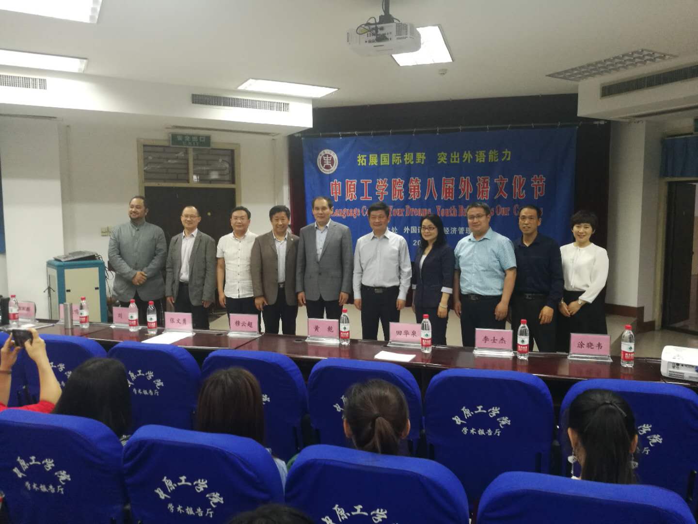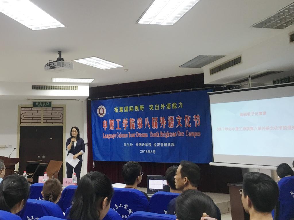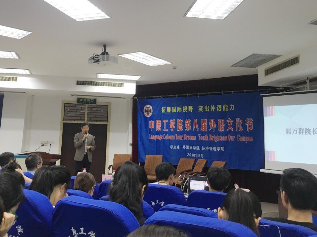 仪式启动前,新葡官网学生精心编排演唱了多首外文歌曲,熟悉的旋律,异样的语言感染了现场观众。随后,在主持人介绍下,新葡官网党总支书记姚晓鸣汇报了上届外语文化节的开展情况,并用流利的英语宣读了《关于举办中原工学院第八届“外语文化节”的通知》。接下来由学生及教师代表发言,来自美国的外教代表Donald结合他在中国教学及生活经历,详细讲述了中西方文化差异对外语学习的影响。Donald诙谐、幽默、风趣的语言,使在场的学生感受到了外语学习的无限趣味。随后汉懿社带来诗朗诵《梦想》,让学生感受到了汉语言文化魅力。接下来,在英语系副主任刘丽老师主持下,由外语学院、经管学院、纺织学院师生共同演绎了关于梦想的英文主题交流会,鼓励同学们筑梦并逐梦。紧接着3003新葡官方网站院长郭万群致开幕词,郭院长肯定了外语文化节在激发学生外语学习热情、提升学生文化素养等方面的重要意义,并鼓励同学们积极参与到文化节中,在外语学习中品味乐趣,实现梦想。开幕式最后,校党委副书记、工会主席黄乾发表了重要讲话并宣布中原工学院第八届外语文化节开幕。