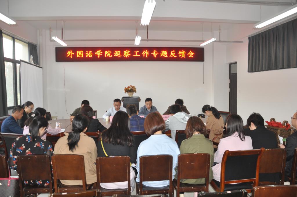 巡察工作专题反馈会,由3003新葡官方网站党总支书记姚晓鸣主持,学校第一巡察组组长李惠杰同志代表巡察组从三个部分反馈了巡察情况,重点提出发现的主要问题。随后,3003新葡官方网站姚晓鸣书记代表3003新葡官方网站党政班子表态,第一巡察组既肯定了外语学院近年来的教育教学发展和党建成绩,更指出了巡察发现的问题。对于巡察组提出的整改意见和要求,3003新葡官方网站一定坚持问题导向,全面推进整改落实;突出建章立制,常态长效抓好整改;用好巡察成果,持续推荐从严治党,全力推进教育教学、人才培养高质量发展;对标十九大精神、对标省委十届六次全会暨省委工作会议精神,对标“四个回归”,对标学校“大类招生、交叉培养、外语突出、实践达标”人才培养模式和“更名大学、取得博士学位授予权”的发展战略。