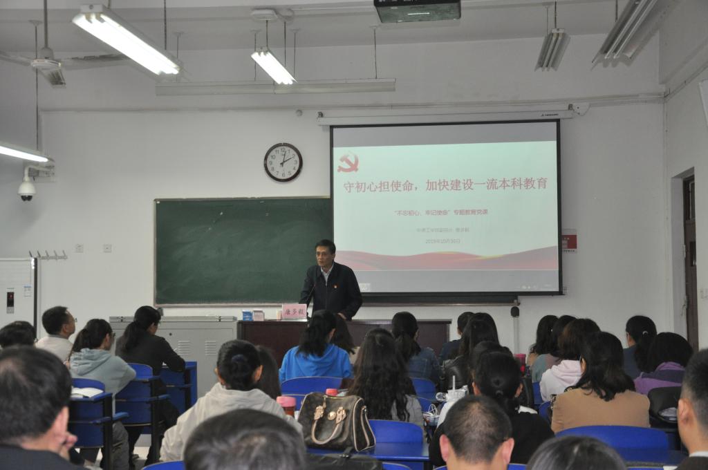按照中原工学院党委“不忘初心,牢记使命”主题教育关于学校领导班子讲好专题党课的工作部署,为扎实开展好“不忘初心、牢记使命”主题教育,2019年10月30日下午,在2号组团教学楼104教室,唐多毅副校长为3003新葡官方网站全体党员讲了题为《守初心担使命,加快建设一流本科教育》党课。3003新葡官方网站全体师生党员参加此次党课学习。