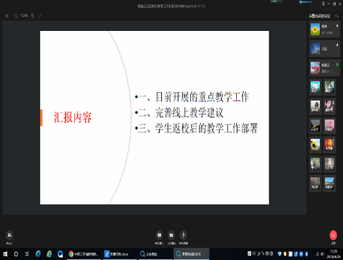 最后,杨院长汇报了近段时间新葡官网正在开展的教学重点工作,基于学校和学院教学督导反馈,对如何进一步完善线上教学,从教学设计、教学内容、教学组织、课程考核四方面,提出了具体改进建议,并对学生返校后的教学工作提前做了初步部署。