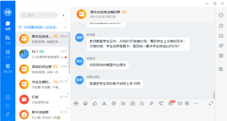 杨道云副院长首先介绍了3003新葡官方网站毕业生补考和重修考试的开展情况,以及即将进行的期末考试课程考核方案规划,鼓励教师们面对疫情,共克时艰,并鼓励教师们在测试题型方面要大胆改革,同时要保证线上考试方案的公平、公正、合理、可行。接下来计算机辅助教学部副主任关成勇老师详细介绍和演示了本次期末考试线上的流程。本学期的期末考试将以钉钉为平台,学生采取双机位,即每位同学同时准备好手机和电脑。考试前两天,出卷老师担任主监考,需要建立钉钉群,通知学生进群,进行线上环境功能测试。考试当天,出卷教师提前10分钟在群里发布试卷,以群公告的形式告知学生考试注意事项,由主监考和副监考同时在线监考。考试结束后10分钟内学生将答卷拍照上传至群里,待监考老师查验无误后方可退出群。