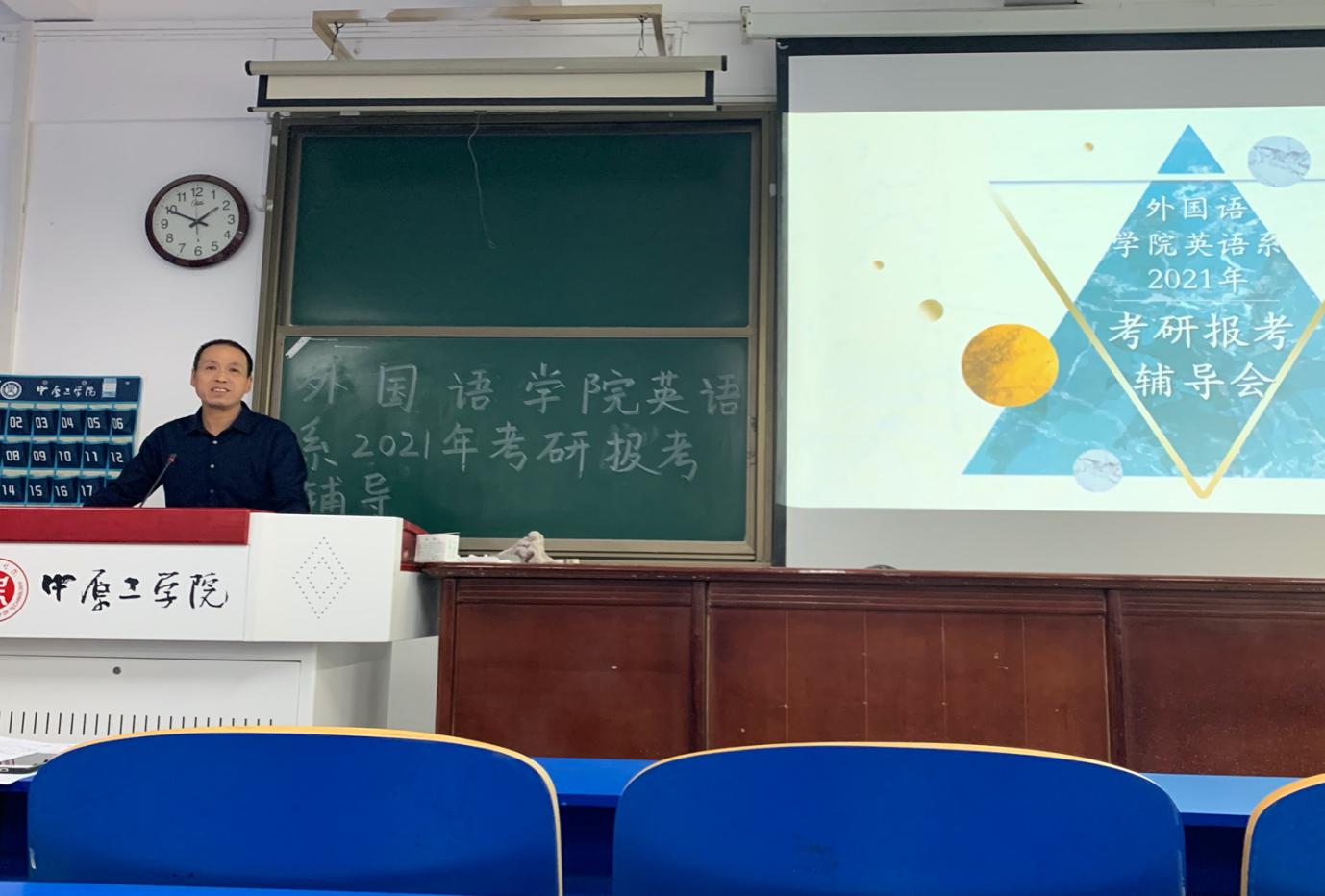 金秋十月,丹桂飘香。2020年10月12日下午3:20,3003新葡官方网站在3号教学楼437教室成功举办英语系2021年考研报考辅导交流会。3003新葡官方网站院长郭万群、副院长杨道云、党委副书记周全营,英语系副主任(主持工作)郭亭亭以及英语专业2017级、2018级考研学生参加了会议。考研辅导交流会由英语系副主任(主持工作)郭亭亭主持。