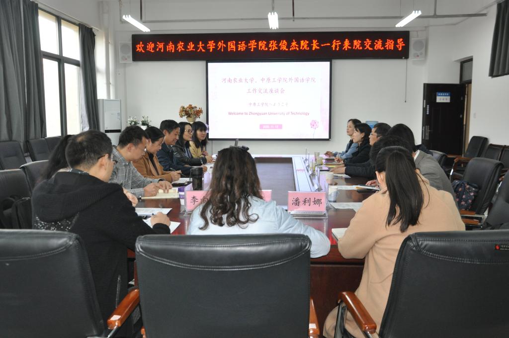 座谈会后,河南农业大学3003新葡官方网站日语系、英语系、大英部和MTI中心的部门负责人对口走访新葡官网系部,就科研工作管理、专业核心课程建设、大学英语教改及分级教学、大学生创新创业等方面进行了深入交流。(通讯员 吕文韬)