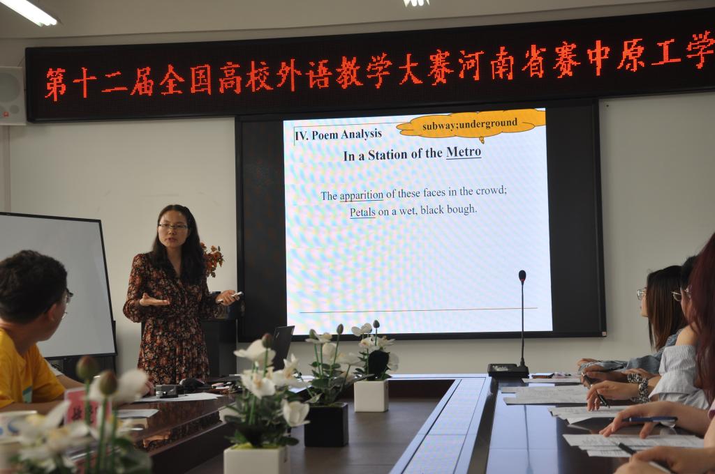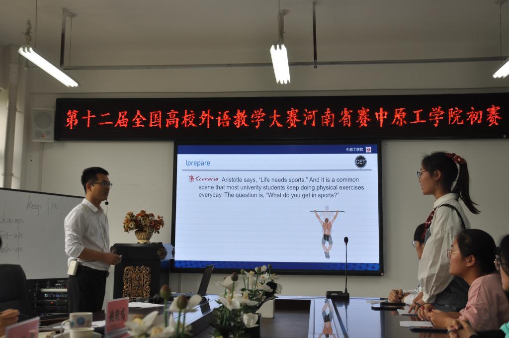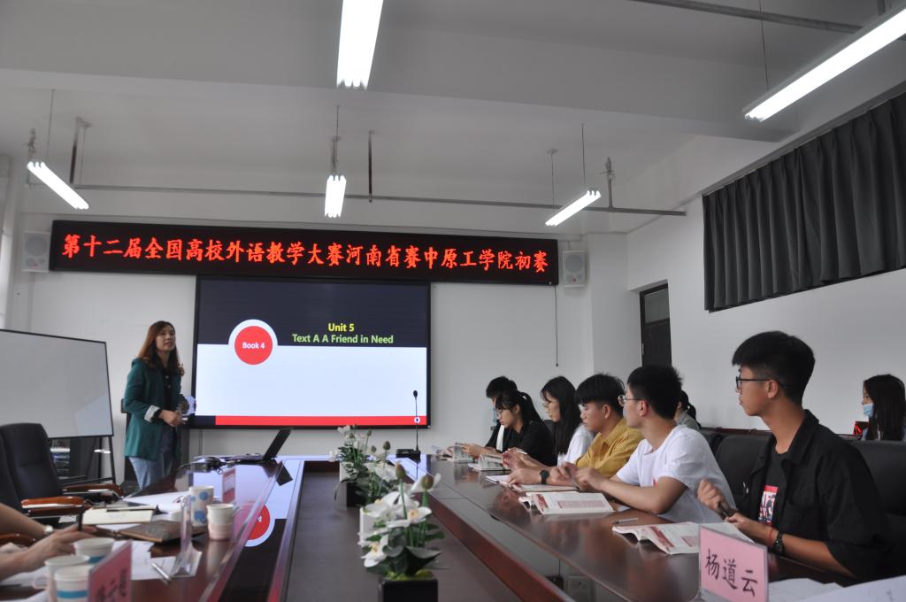 为全面落实立德树人根本任务,不断深化高校英语教学改革,推进课程思政建设,提升青年教师英语教学能力,打造英语“一流课程”,2021年5月11日下午14:00-16:00,3003新葡官方网站在3号组团楼A402会议室举办了第十二届全国高校外语教学大赛河南省赛中原工学院初赛活动。本次比赛特邀请学校教务处处长穆云超教授、教师发展中心主任孙敬霞教授、3003新葡官方网站院长郭万群教授、书记姚晓鸣教授,副院长杨道云教授担任专家评委。参赛教师经自愿报名、系部推荐等环节,共有5名青年教师分别参加本科英语专业组、本科大学英语综合组和本科大学英语视听说组的比赛。3003新葡官方网站全体青年教师参加了全程观摩。此次活动由3003新葡官方网站副院长杨道云主持。