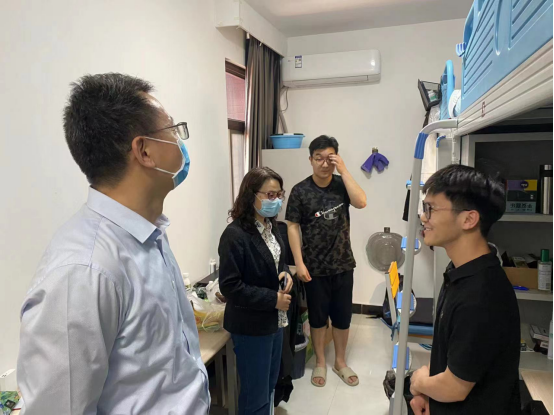 5月1日,学院院长姚晓鸣带队,副院长柴高洁、副院长薛冬梅、学科秘书吕文韬、辅导员刘爽一起走访了研究生宿舍。查看和了解了研究生宿舍的生活环境和学习环境,勉励学生要利用宿舍不同专业共同居住的生活环境,加强跨学科思维,共同探讨问题,营造宿舍研究学习的好习惯。针对学生反应的生活问题,学院也做好了相应记录,帮助学生解决。