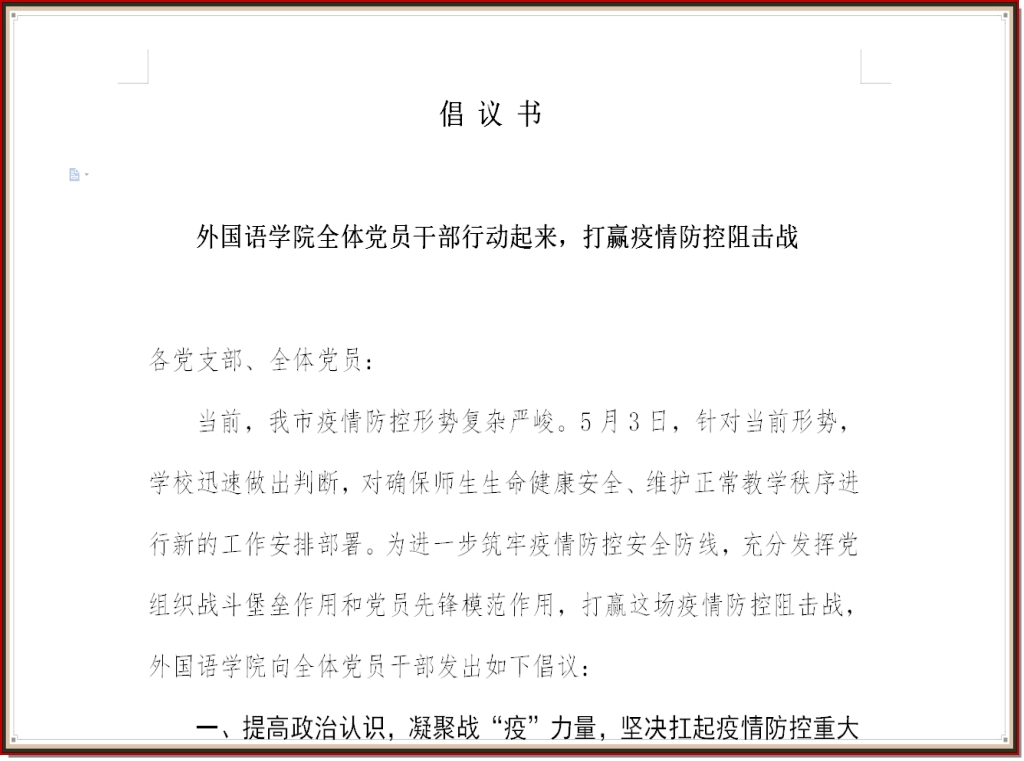 当前,我市疫情防控形势复杂严峻,为迅速落实学校党委疫情防控工作部署,进一步筑牢疫情防控安全防线,充分发挥党组织战斗堡垒作用和党员先锋模范作用,近日,3003新葡官方网站党委向学院全体党员干部发出倡议书,号召大家行动起来,打赢这场疫情防控阻击战。