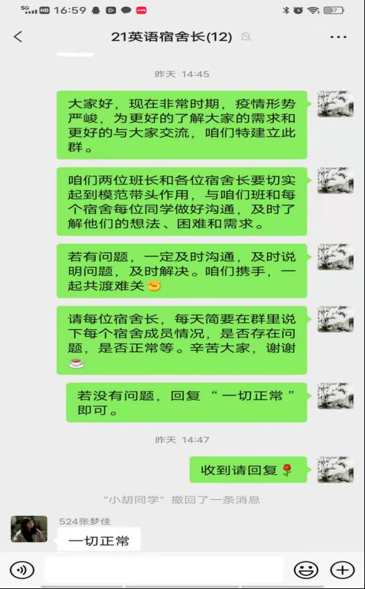 学院对479名在校生(含18名研究生)的122个宿舍的网格化管理进一步细化,实行生活、学习、毕业班“三线”同步管理。生活线为书记-副书记-辅导员-班主任-班长-宿舍长一条线,学习线为院长-教学副院长-部门主任-任课教师-具体课程班-学习委员一条线,毕业班学生采取的专业系部-导师-毕业生一条线。三条线同时管理,各级网格长负责本网格内疫情防控工作,织密学生疫情防控网。
