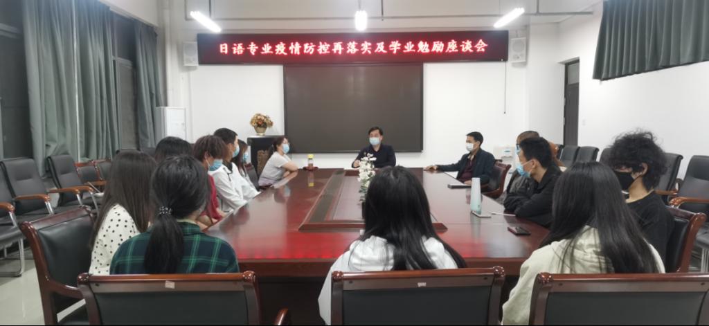 围绕进一步夯实疫情防控责任,加强学生对学校的防疫政策入脑入心,以及如何在疫情防控常态化下高质量地完成学业,从而实现自己的人生目标等内容,5月13日晚上8:00点,3003新葡官方网站志愿者教师在3号组团楼A402会议室召开了“日语专业疫情防控再落实及学业勉励座谈会”。会议由日语系教师王学鹏主持,石志亮老师、吕文韬老师参加了座谈。