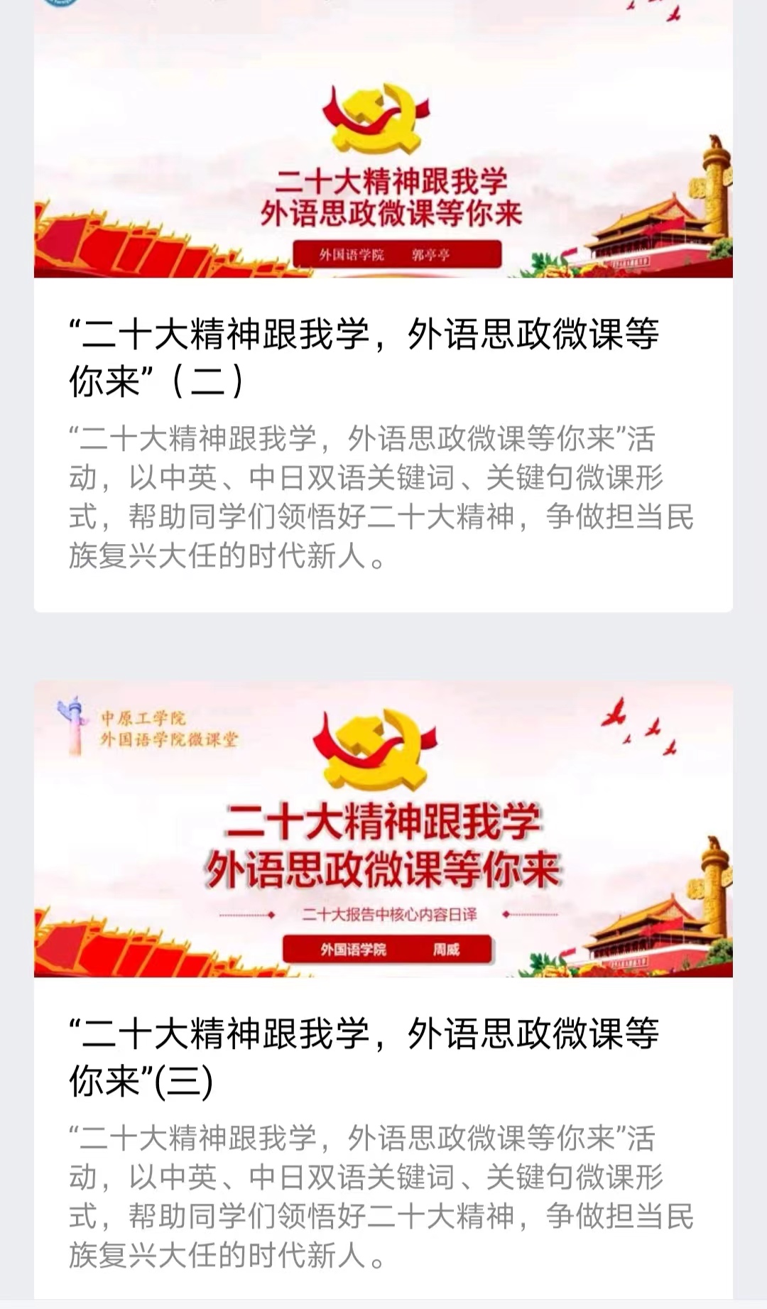 为营造学习党的二十大精神的浓厚氛围,深刻领会党的二十大报告中蕴含的新思想、新观点、新理论,3003新葡官方网站与教务处一起组织外语课程思政教学团队制作学习党的二十大精神双语微课,与校团委携手举办英文朗诵比赛,深入学习党的二十大精神。