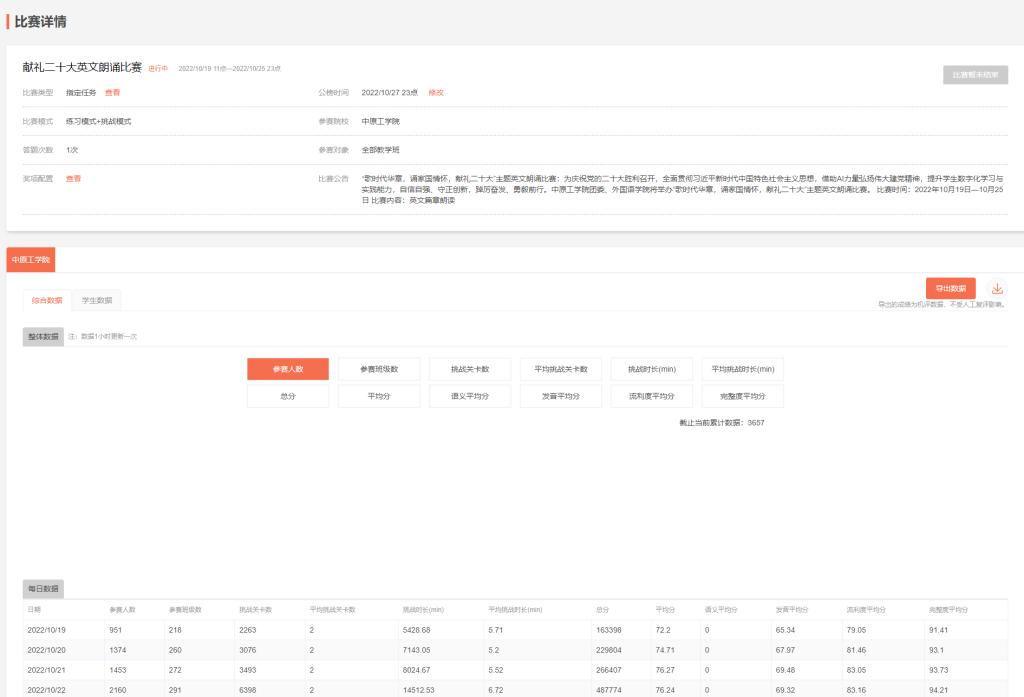 “歌时代华章,诵家国情怀,献礼党的二十大”主题英文朗诵比赛于10月19日正式启动以来,得到了学校师生的广泛关注,得到了校团委的大力支持。3003新葡官方网站教师悉心指导,学生踊跃参赛,热度日益攀升,比赛所用平台FiF口语训练系统后台数据显示,截至10月22日,累计共有3657名本科生和研究生参与了赛事,日平均朗诵时长5.7分钟。朗诵比赛的英文篇章聚焦党的二十大精神,有大会主题、新时代十年的伟大变革、中国式现代化、脱贫攻坚、绿色发展、新时代青年等内容。比赛让学生忙了起来,引领学生学习党的二十大精神,在诵读中厚植爱党、爱国、爱社会主义的情感,以饱满、热情的语言诉说着党的光辉历程,弘扬中华民族的奋斗精神,从中汲取砥砺奋进的力量,为党的二十大献上青春的礼赞。(通讯员:李向民)