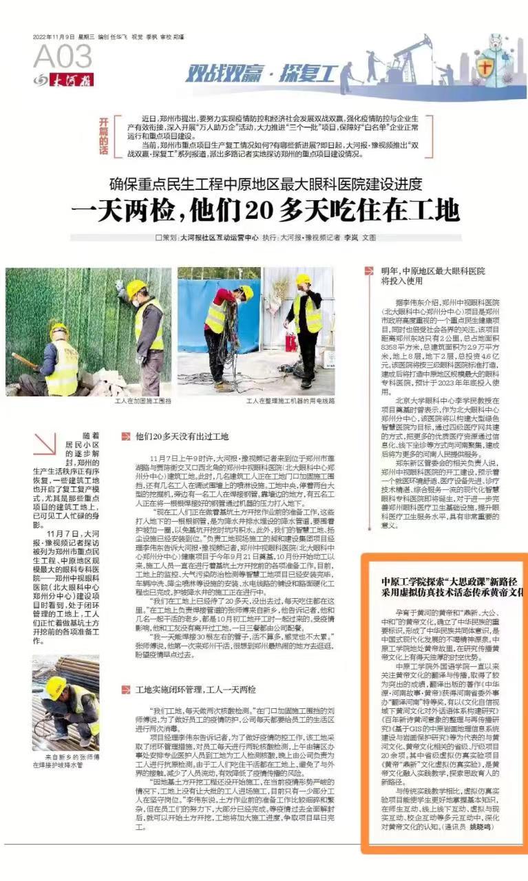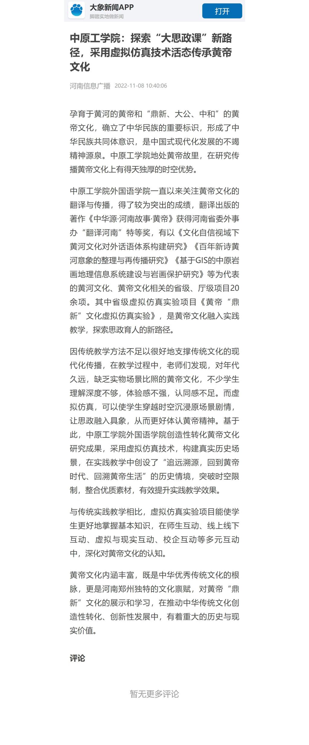 中原工学院3003新葡官方网站一直以来关注黄帝文化的翻译与传播,得了较为突出的成绩,翻译出版的著作《中华源·河南故事·黄帝》获得河南省委外事办“翻译河南”特等奖,有以《文化自信视域下黄河文化对外话语体系构建研究》《百年新诗黄河意象的整理与再传播研究》《基于GIS的中原岩画地理信息系统建设与岩画保护研究》等为代表的黄河文化、黄帝文化相关的省级、厅级项目20余项。其中省级虚拟仿真实验项目《黄帝“鼎新”文化虚拟仿真实验》,是黄帝文化融入实践教学,探索思政育人的新路径。