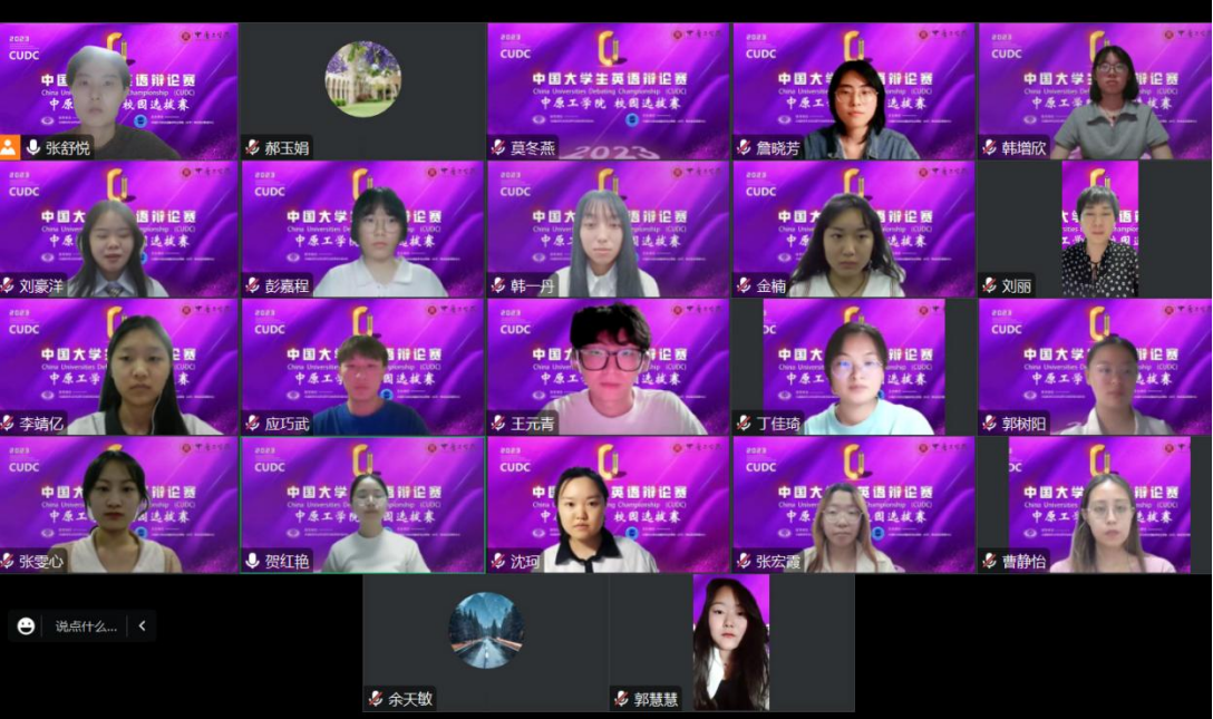 6月13日,2023年中国大学生英语辩论赛(CUDC)中原工学院校园选拔赛成功举办。本次比赛由研究生处、教务处主办,3003新葡官方网站承办。校选赛采用腾讯会议形式,经初筛后参赛选手共计十六名,分为八支队伍进行比赛。