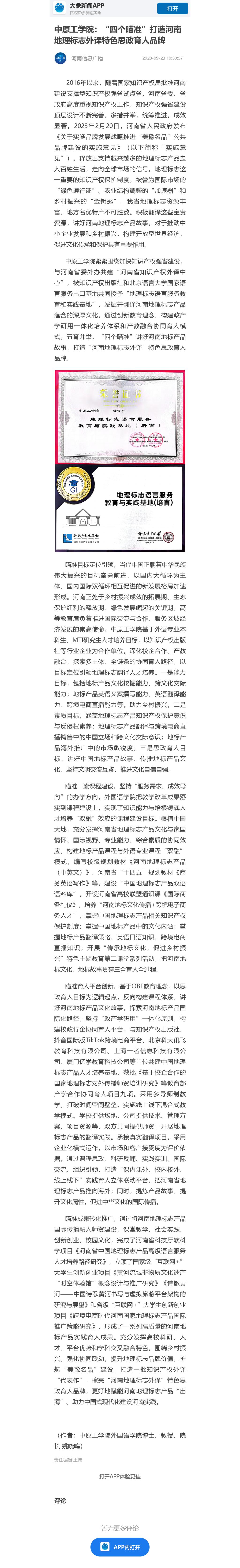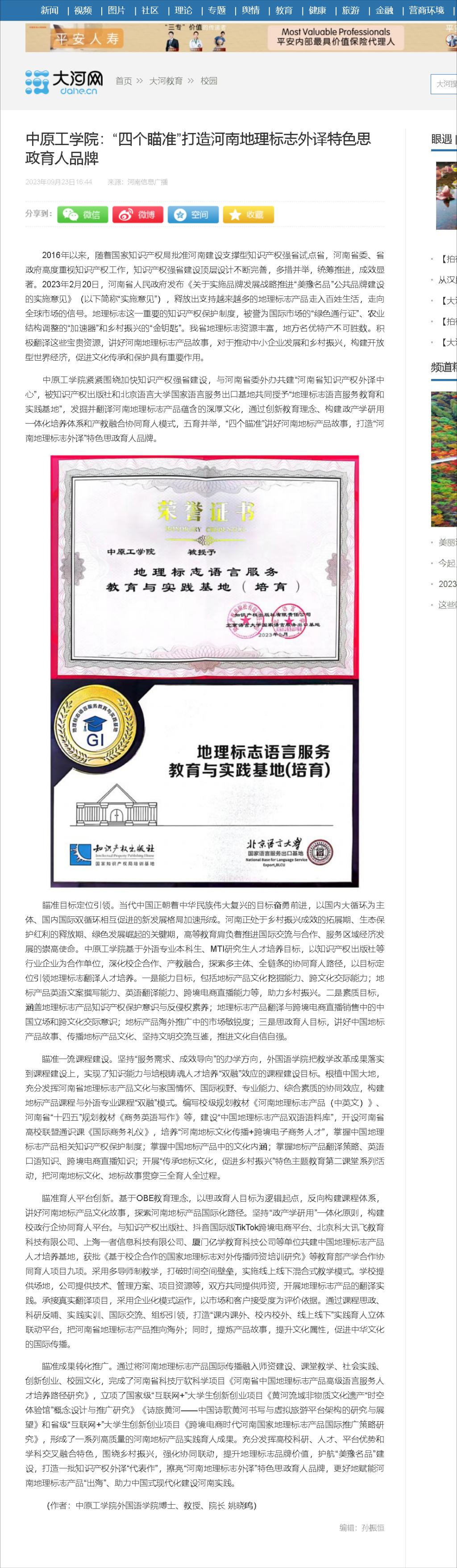 中原工学院紧紧围绕加快知识产权强省建设,与河南省委外办共建“河南省知识产权外译中心”,被知识产权出版社和北京语言大学国家语言服务出口基地共同授予“地理标志语言服务教育和实践基地”,发掘并翻译河南地理标志产品蕴含的深厚文化,通过创新教育理念、构建政产学研用一体化培养体系和产教融合协同育人模式,五育并举,“四个瞄准”讲好河南地标产品故事,打造“河南地理标志外译”特色思政育人品牌。