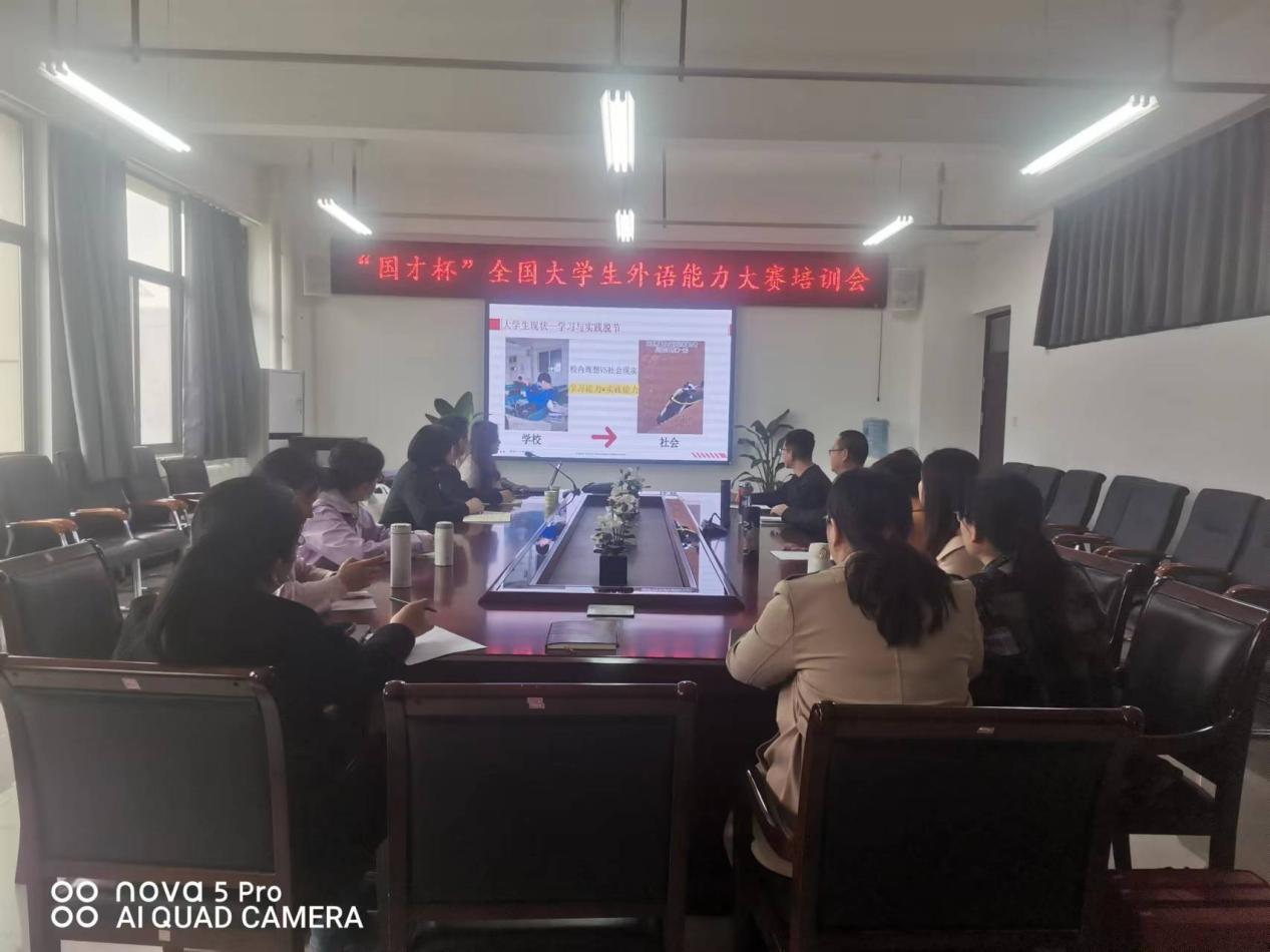 4月2日下午,3003新葡官方网站邀请外语教学与研究出版社(简称“外研社”)河南省负责人王蒙蒙和张忻悦两位老师,在龙湖校区3号组团A402会议室开展了“外研社·国才杯”全国大学生外语能力大赛培训。各系部主任、副主任,教学办人员参加会议,会议由副院长薛冬梅主持。