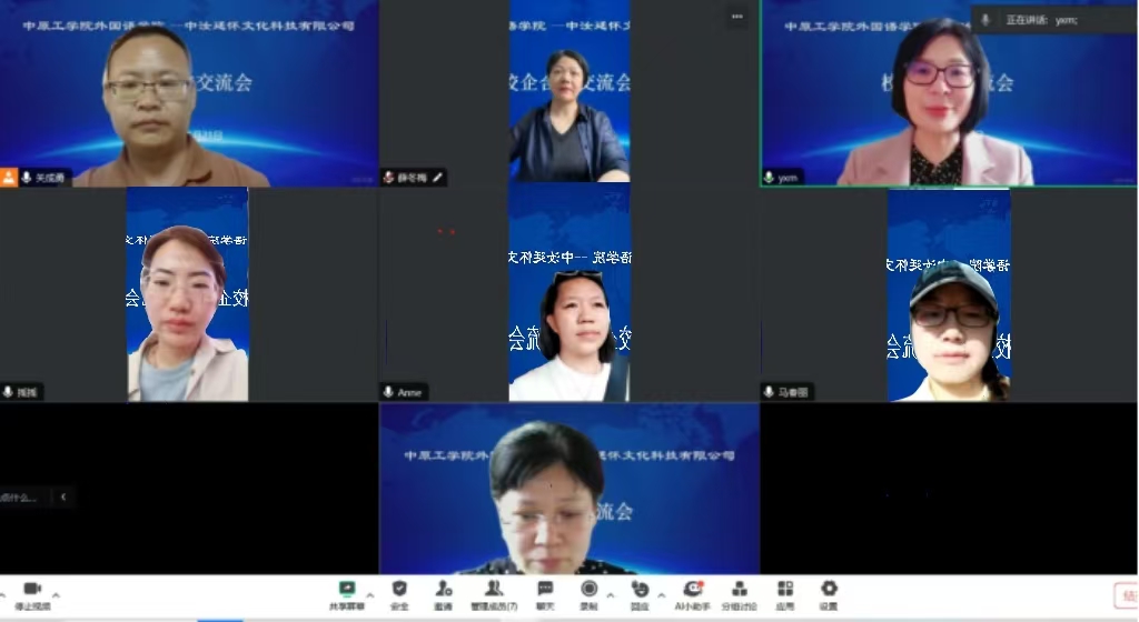 5月21日下午,新葡官网与中汝廷怀文化科技有限公司通过腾讯会议开展校企合作线上交流会,中汝廷怀文化科技有限公司执行董事长程虹、董事长助理张慕瑶,3003新葡官方网站院长姚晓鸣、副院长薛冬梅、MTI硕士点负责人马春丽、英语系主任郭亭亭、大外四部主任关成勇出席会议。会议由薛冬梅主持。