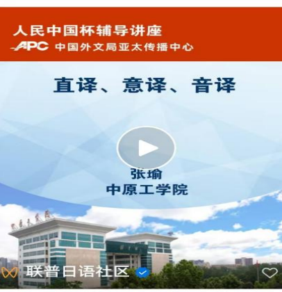 近日,第七届“人民中国杯”日语国际翻译大赛开赛,大赛期间,新葡官网日语专业张瑜博士应主办方之邀,为参赛选手及日语学习爱好者开展了一场关于翻译方法的公开辅导讲座。张博士在30分钟的视频讲座中,饶有趣味地讲解了直译、意译与音译这三种主要翻译方法,并借具体案例剖析了其在不同情境下的运用及技巧,在日语界引起了广泛关注。