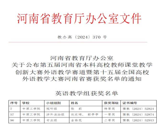 近日,河南省教育厅发布了《第五届河南省本科高校教师课堂教学创新大赛外语教学赛道暨第十五届全国高校外语教学大赛河南省赛获奖名单的通知》(教办高〔2024〕370 号)。新葡官网教师炊衣琦、郭亭亭获英语教学组的涉外法治组河南省一等奖1项。在本届赛事中,新葡官网荣获特等奖、一等奖、二等奖共3项。