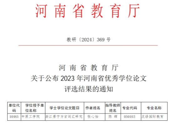 近日,河南省教育厅下发《关于公布2023年河南省优秀学位论文评选结果的通知》(教研〔2024〕369号),新葡官网18篇本科毕业设计(论文)获评2023年河南省优秀学士学位论文(设计)。其中,新葡官网汉语国际教育系陈辉老师指导的张心怡同学《浙江景宁方言词汇研究》学士学位论文获评河南省优秀学士学位论文。