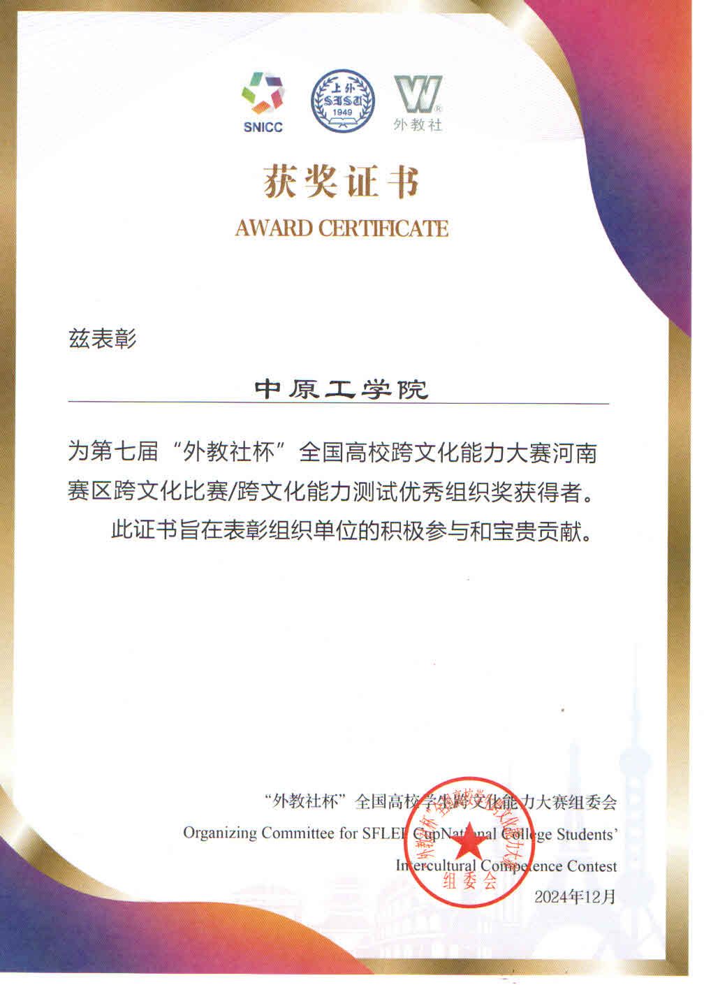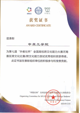 2025年1月4日,由河南省高教学会外语教学研究分会、上海外语教育出版社联合举办的人工智能时代的外语学科发展研讨会暨外教社中原外语名师大讲堂总结会在郑州召开。会议对2024年河南省各高校组织参加外教社杯全国高校外语教学大赛、外教社“词达人杯”词汇竞赛和“外教社杯”全国高校学生跨文化能力竞赛的先进单位进行表彰。新葡官网喜获第七届“外教社杯”全国高校学生跨文化能力大赛河南赛区优秀组织奖。
