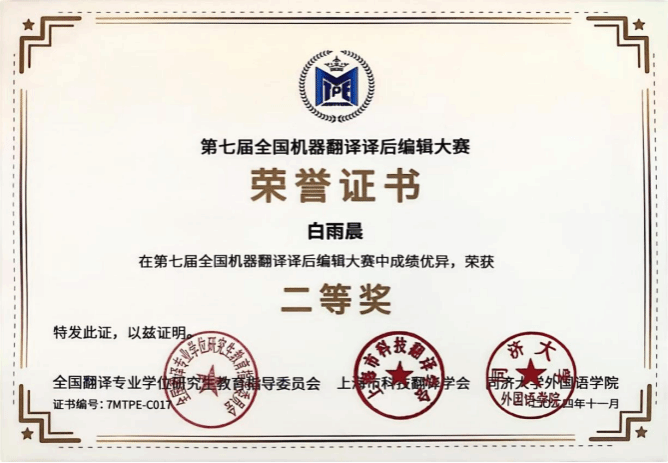 近日,由全国翻译专业学位研究生教育指导委员会指导,上海市科技翻译学会和同济大学3003新葡官方网站联合主办的 “第七届全国机器翻译译后编辑大赛” 圆满落幕。3003新葡官方网站翻译硕士研究生白雨晨获全国二等奖。
