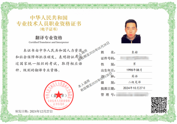 近日,新葡官网首届翻译硕士研究生袁赫通过2024年全国翻译专业资格考试,喜获英语二级笔译证书。