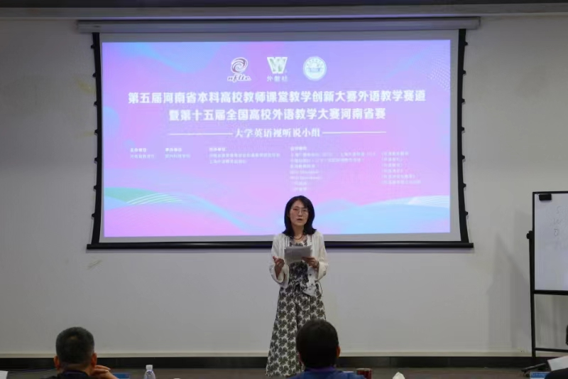 第五届河南省本科高校教师课堂教学创新大赛外语教学赛道暨第十五届全国高校外语教学河南省赛分为英语教学组、跨文化组和思政微课组3个类别,其中,英语教学组分为大学英语综合小组、大学英语视听说小组、英语专业小组、涉外法治教学小组。本届大赛由河南省教育厅主办,分别由河南牧业经济学院、郑州科技学院、许昌学院、河南城建学院承办,河南省高等教育学会外语教学研究分会和上海外语教育出版社联合协办。在复赛和决赛的层层选拔中,张莉老师凭借深厚的专业功底、独具匠心的教学设计以及生动精彩的课堂表现,展示出良好的教学理论素养和教学能力,赢得了评委和观众的高度称赞。