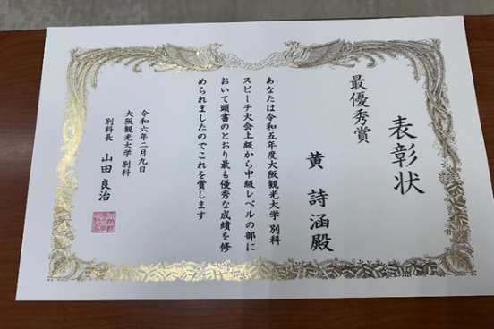近日,新葡官网海外交换生日语系黄诗涵同学,在日本大阪观光大学日语演讲比赛中,取得第一名。