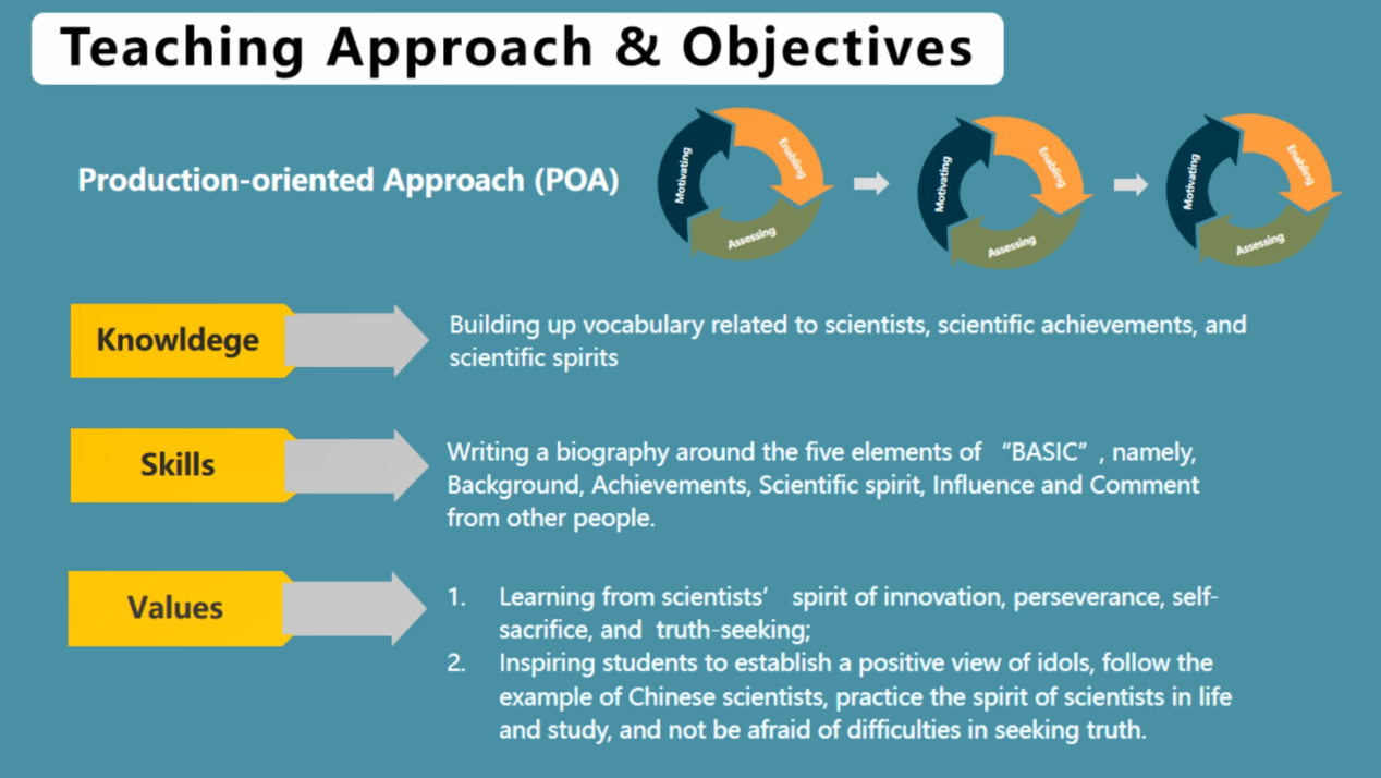 全国高校外语教学大赛覆盖全国千余所高校,因其严谨、创新、公正、权威,位列全国外语类赛事首位。本次比赛由河南省高等教育学会外语教学研究分会、上海外语教育出版社联合协办,全省共32个微课团队提交了参赛作品,竞争激烈。新葡官网教师团队精心选材,以《全新版大学英语综合教程(第三册)》第四单元“Imagination and Creativity”为思政教学点,运用产出导向法,阐释科学写作要素,启发学生树立积极正确的价值观、偶像观,引导学生以爱国科学家为榜样,践行科学家们所崇尚的执着专注、精益求精的工匠精神,涵养家国情怀,实现外语显性学习和课程隐性教育的有机统一。