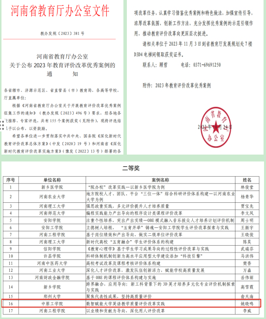 近日,河南省教育厅办公室下发了《关于公布2023年教育评价改革优秀案例的通知》(教办发规〔2023〕381号),新葡官网姚晓鸣教授团队申报的《数智赋能大学英语教学质量评价改革实践》获河南省教育评价改革优秀案例二等奖。