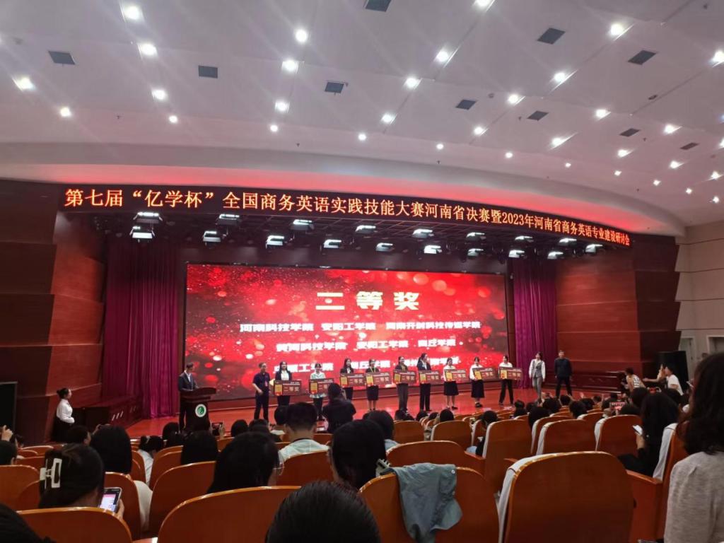 9月24日,第七届“亿学杯”全国商务英语实践技能大赛河南赛区(省决赛)在平顶山学院圆满落幕。新葡官网英语专业学生王浩权、张颖、刘朋雨、李畅畅和经济管理学院国际贸易专业学生刘萍萍组成的团队荣膺河南省二等奖。