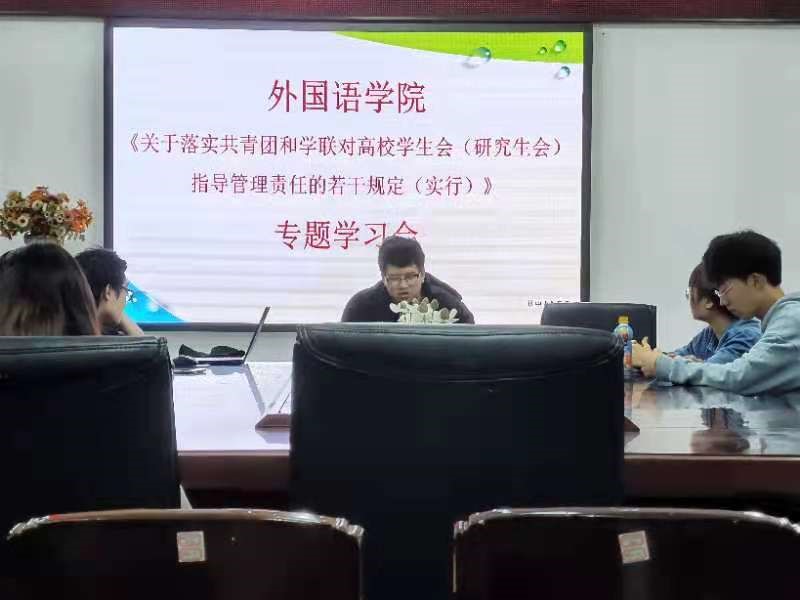 副主席余子鑫就《关于落实共青团和学联对高校学生会(研究生会)指导管理责任的若干规定》文件开展解读,并严格贯彻落实文件精神,统筹规划学生会工作,推广好的做法和经验,及时发现问题,及时总结改正问题;