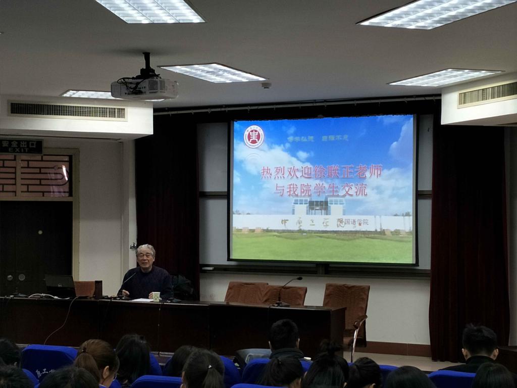 徐联正老师曾经长期从事学生工作,长期担任领导职务。退休后一直心系学生,关注学校发展,义务作报告几百场,近十万人受益。本次交流虽然时间不长,但正如徐老师所说“没有知识就没有能力,没有能力就没有工作,没有工作就没有理想,没有理想就没有目标。”相信大家能从这场短暂但真诚的交流中,找到自己的理想信念。