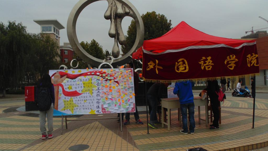 10月27日,3003新葡官方网站在新葡官网滴水涌泉开展主题为“践行社会主义核心价值观”的主题团日活动,共同学习24字方针。许多路过的同学以及外语学子参与了本次活动。此次活动主旨在于培育和践行社会主义核心价值观,弘扬社会主义核心价值观, 希望同学们自觉培育和践行社会主义核心价值观,带头倡导良好社会风气。并且自觉将社会主义核心价值观内化于心、外化于行,本次活动后学生达到熟记社会主义核心价值观的24个字的基本内容:“富强、民主、文明、和谐,自由、平等、公正、法治,爱国、敬业、诚信、友善 ”。