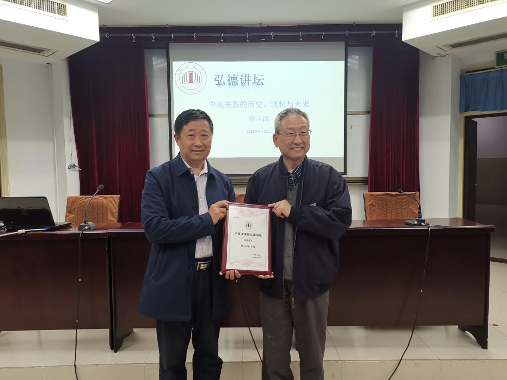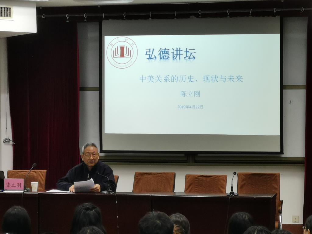 2019年4月22日下午,应3003新葡官方网站邀请,中国外交部原驻外大使、总领事陈立钢大使在龙湖校区4号楼311学术报告厅为新葡官网师生作了题为《中美关系的历史、现状与未来》的精彩讲座,讲座现场座无虚席,3003新葡官方网站二百余名师生到现场聆听了报告会,讲座由3003新葡官方网站党委书记姚晓鸣主持。