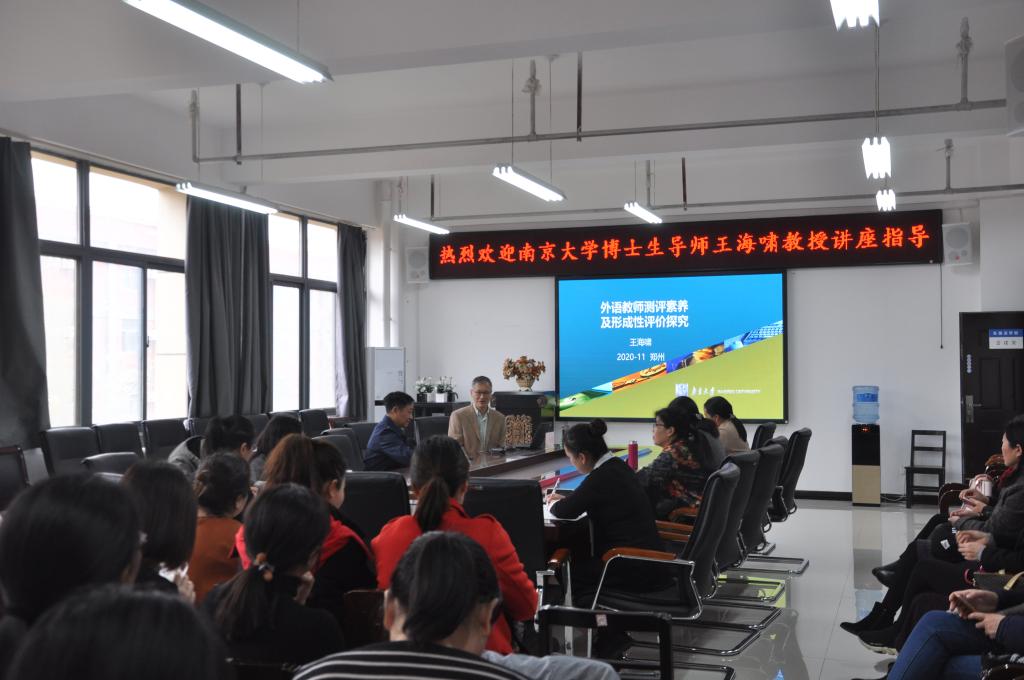 2020年11月18日下午1:30,应3003新葡官方网站邀请,南京大学博士生导师王海啸教授,在龙湖校区3号组团楼A402会议室,为新葡官网教师作了精彩的题为“外语教师测评素养及过程性评价探究”讲座,3003新葡官方网站全体老师聆听了此次讲座,讲座由3003新葡官方网站院长郭万群主持。