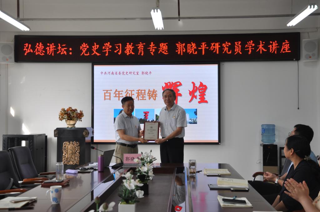 6月3日下午,应3003新葡官方网站邀请,中共河南省委党史研究室原副主任、郑州大学教授、河南省中共党史学会副会长郭晓平研究员做客新葡官网弘德讲坛,在龙湖校区3号组团楼A402,为新葡官网师生作了题为“百年征程铸辉煌—中国共产党在河南历史巡礼”的精彩讲座。3003新葡官方网站院长郭万群为郭晓平颁发弘德讲坛主讲证书。3003新葡官方网站副院长柴高洁主持讲座,3003新葡官方网站、马克思主义学院教师及部分学生党员聆听讲座。