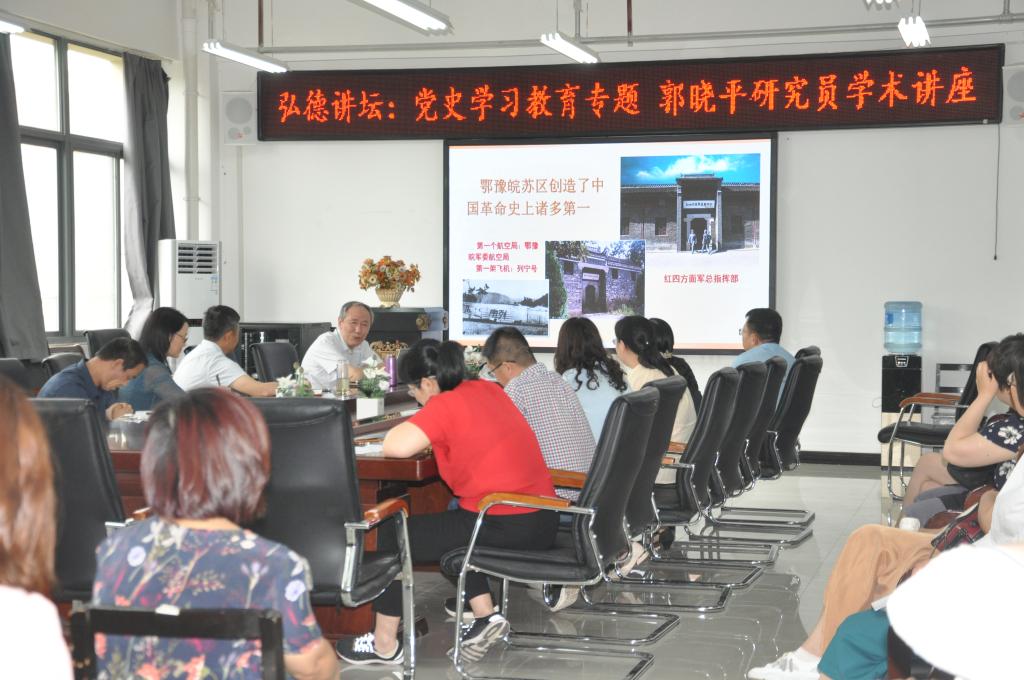 郭晓平首先介绍了开展河南地方党史学习的原因和意义。接着,他以丰富的史料带领大家从十二个方面重温中国共产党在河南的光辉奋斗历程,并详细讲解了第一次陇海铁路工人大罢工、京汉铁路工人大罢工、大革命高潮和省级党组织的建立、大革命时期的河南农民运动、鄂豫皖革命根据地、胜利的中原突围、淮海战役与河南全省解放等事件的重要人物、历史内容和深远意义。郭晓平在讲解中以大量党史资料为依据,结合河南大地英雄人物事迹,阐释了中国共产党人所继承与坚持的崇高理想,并教导师生要发扬革命先烈顽强拼搏、不畏牺牲的奋斗精神,更要学会总结历史经验教训,汲取开拓前进的智慧和力量,做新时代的先锋。