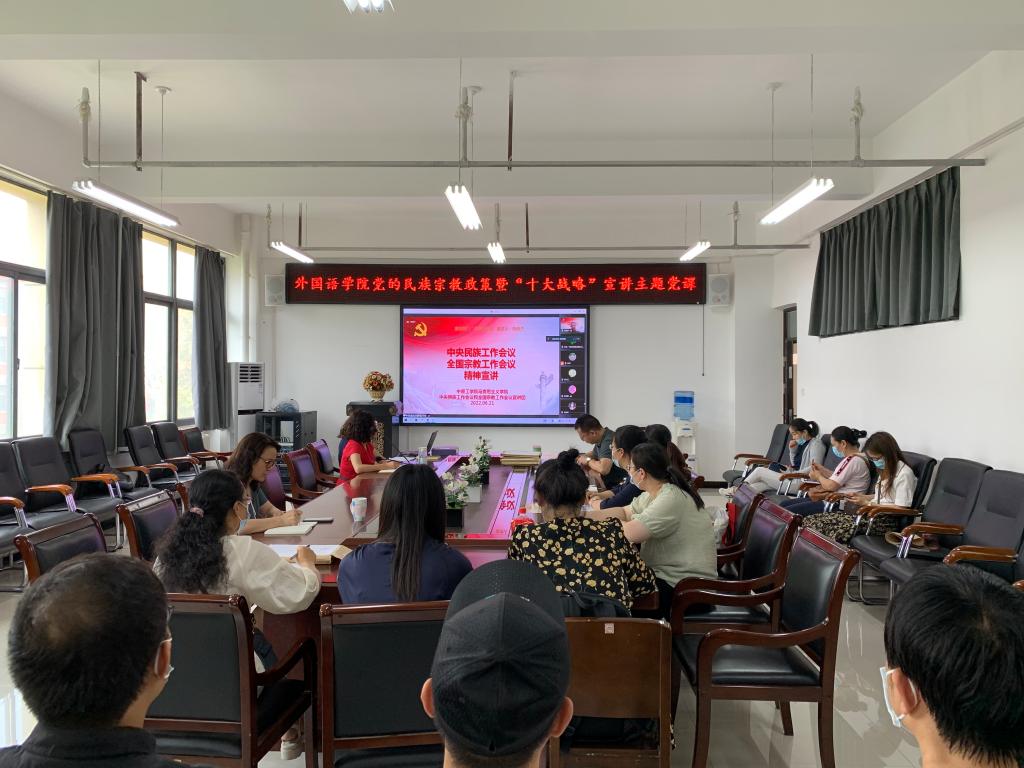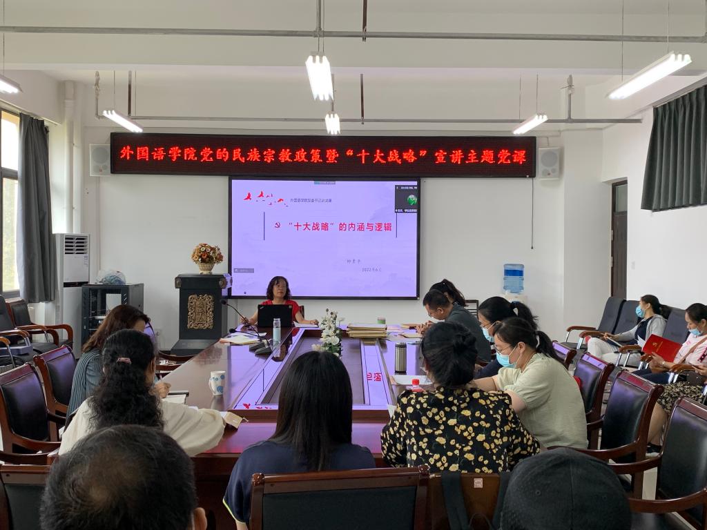 仲夏之月,万物方盛。6月21日下午,3003新葡官方网站举办党的民族宗教政策宣讲会,并开展“十大战略”主题党课活动。会议邀请马克思主义学院民族宗教工作宣讲团成员陆俊杰博士作专题报告;3003新葡官方网站党委书记柳素平以“’十大战略’的内涵与逻辑”为题,为全院党员讲专题党课,3003新葡官方网站党委委员、领导班子成员和全体师生党员以线上线下相结合的方式参加,副院长柴高洁主持会议。