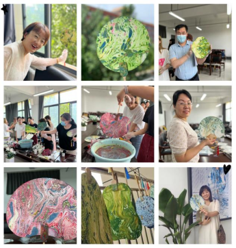 在活动现场,来自“布可思绎”工作室的同学们首先向参与者们详细介绍了漂漆团扇的制作过程,接着,参与者们开始自己动手。老师们先在水盆里泼洒了自己选中的配色颜料,然后将团扇小心翼翼的放入水中再轻轻拿出水面,不同形状的团扇上面便出现了各种各样、精彩绝伦的图案,活动现场不时传来赞美的惊呼声。