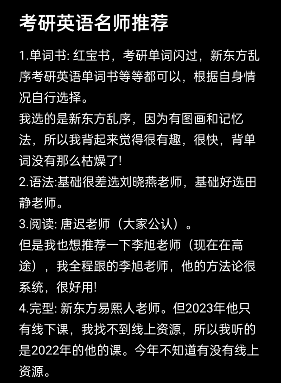 (5)冲刺期:12月-考试。这一阶段进行专业课模拟、政治大题背诵、英语真题单词复习、作文背诵,以回顾和保持学习、题感为主。