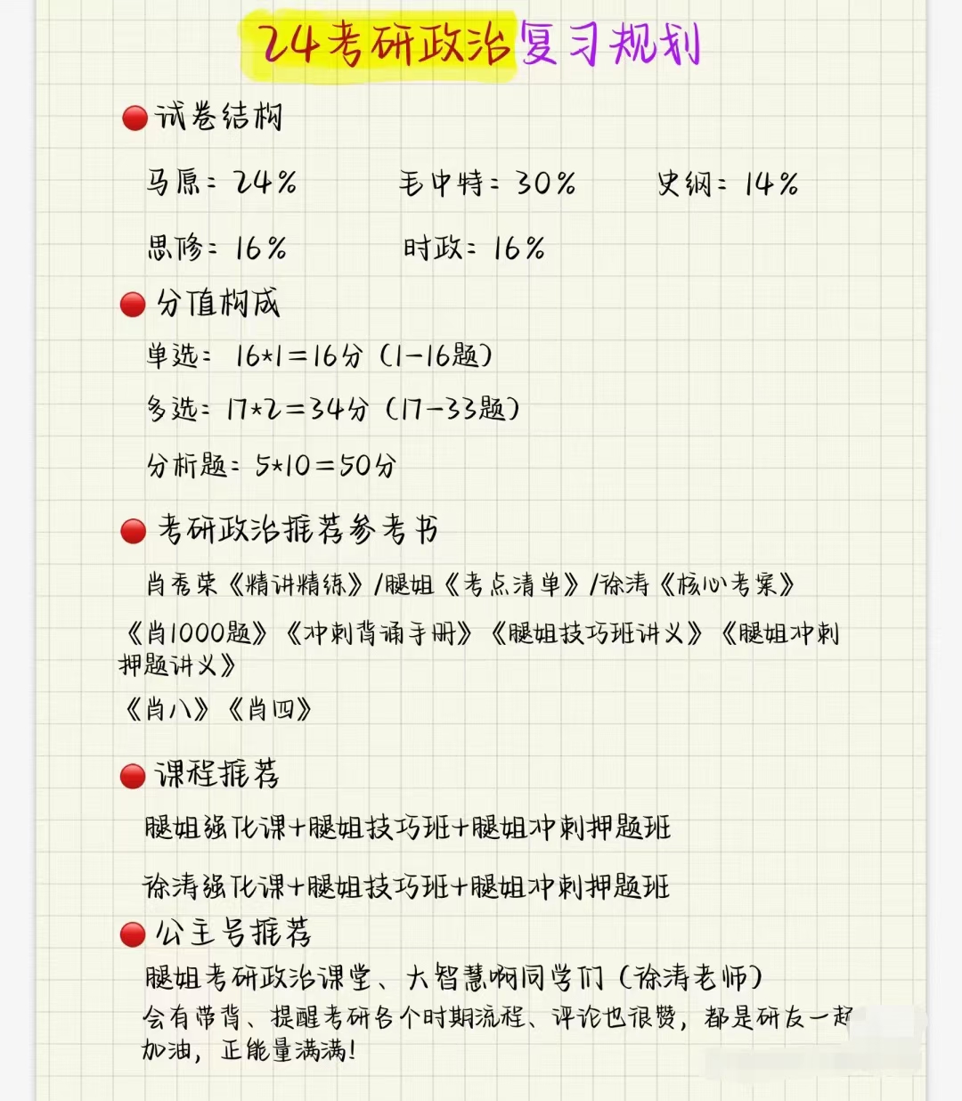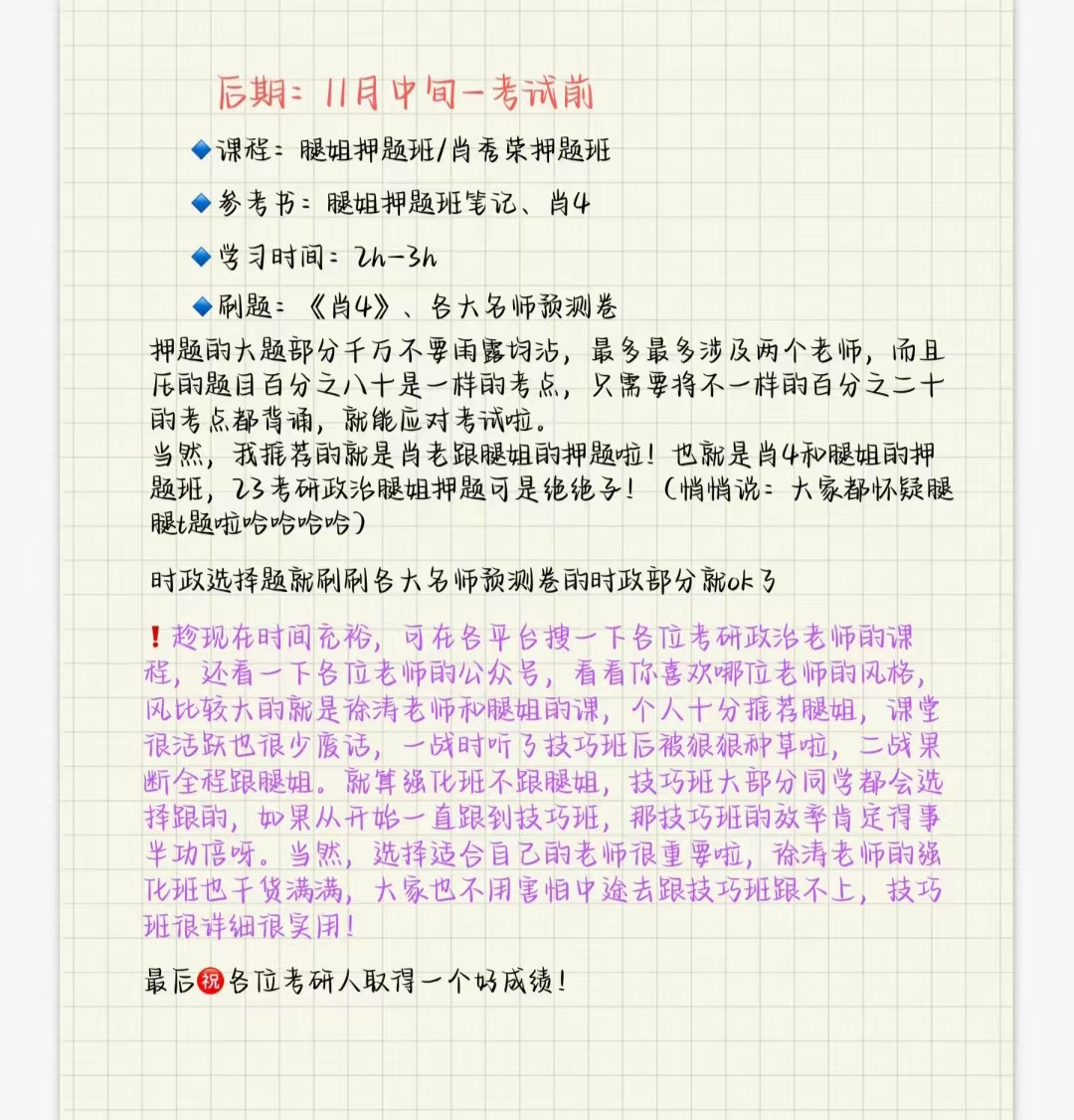 C. 政治是结合肖老师的资料、听腿姐的课,11月中之前都是在做政治选择题,选择题非常重要!11月中之后开始背大题,主要是腿姐的冲刺背诵手册和肖四。